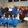 Les licenciés du club devant le matériel pédagogique (cage pliante, chasubles,ballons,coupelles ...) fournit par le District de la Loire